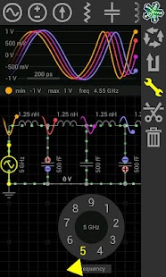 Build any circuit, tap play button, and watch dynamic voltage, current, and charge animations. This gives you insight into circuit operation like no equation does. While simulation is running, adjust circuit parameters with analog knob, and the circuit responds to your actions in real time. You can even generate an arbitrary input signal with your finger!