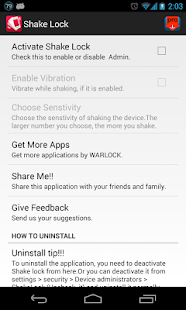 Lock the screen with ease. You can lock the screen by just shaking your device.This is very simple and light weight application, with no ads.With this application you don’t need to press the power button to lock the screen. Just install the application and activate it. Device admin(this is just for the permission to lock the screen, nothing else) and select the suitable sensitivity and the application is ready for use. Just exit the application and shake it.